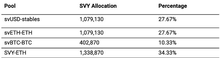 To ensure deep liquidity for liquidity pools on the Savvy protocol, 3,900,000 SVY (39.0%) are allocated to incentivize liquidity providers. These SVY emissions occur on a monthly basis and are subject to DAO governance. In the near future, veSVY holders will be able to vote on how to allocate emissions to liquidity pools using a gauge voting mechanism.